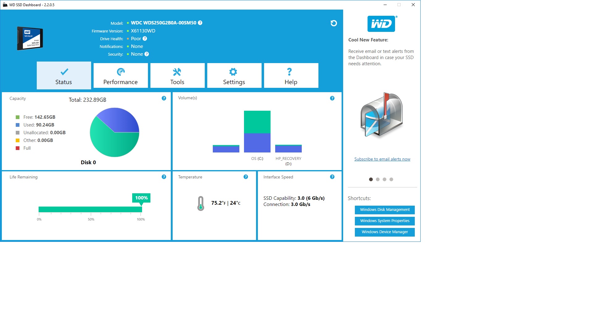 Used Macrium to clone onto WD SSD drive, everything working fine. Then installed WD SSD Dashboard software which promptly declared the drive health “poor” though the SMART tests are error free, no “grown” bad blocks, 100% reserve space. 0.04% drive wear.